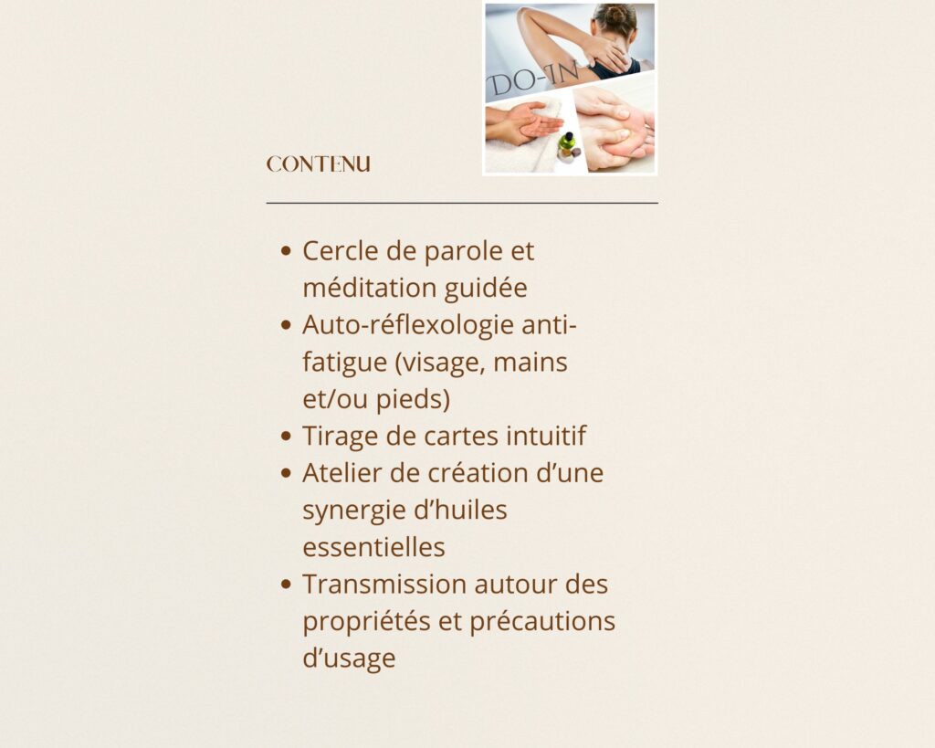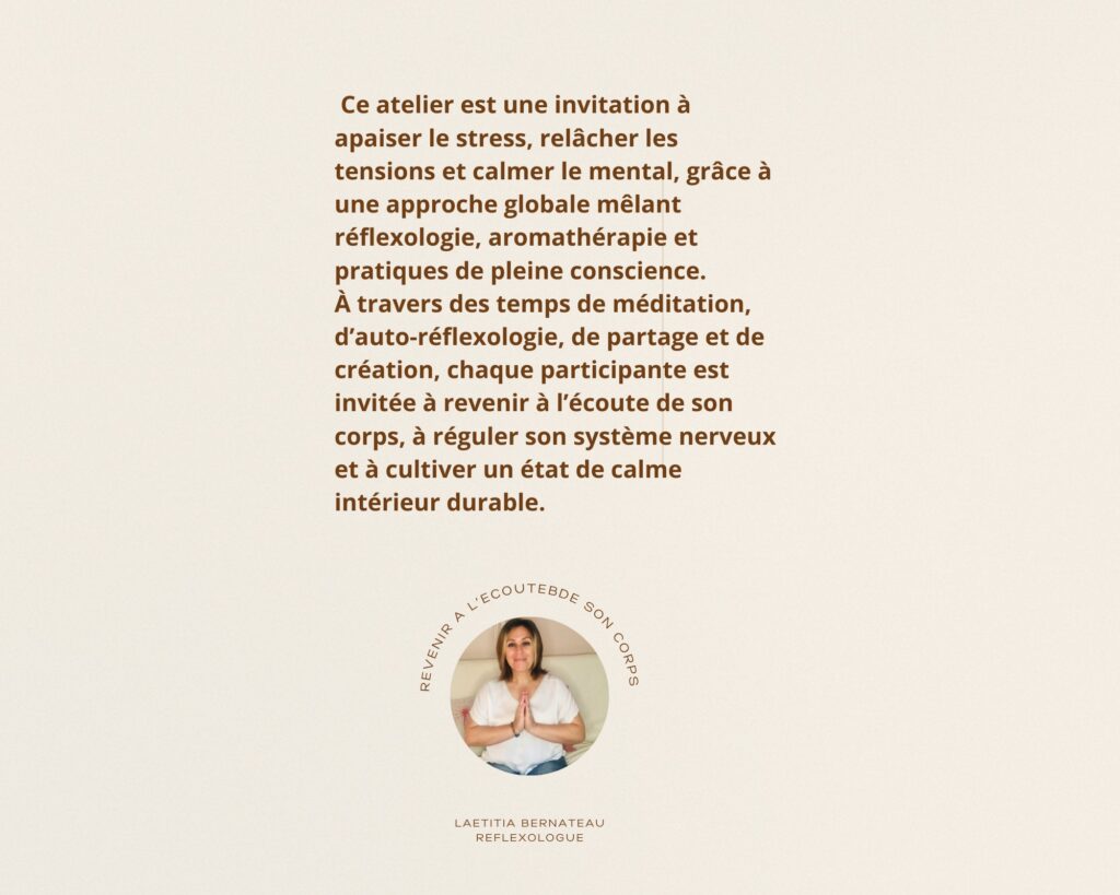 Cet atelier est conçu comme une parenthèse douce et sécurisante, mêlant réflexologie, aromathérapie et pratiques de pleine conscience, pour vous aider à apaiser votre système nerveux et repartir avec des outils simples à utiliser au quotidien.